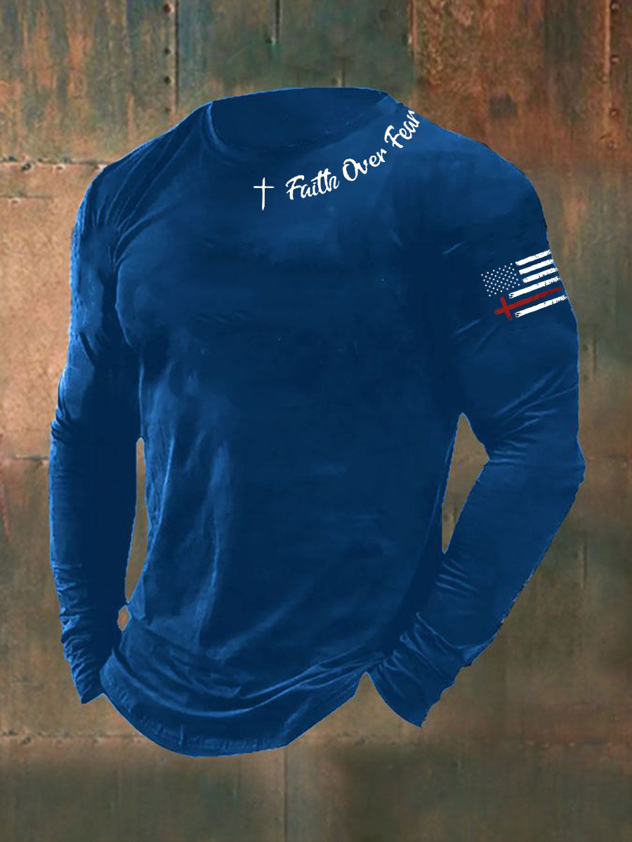 Men's Faih Over Fear Flag Cross Print Long Sleeve T-shirt