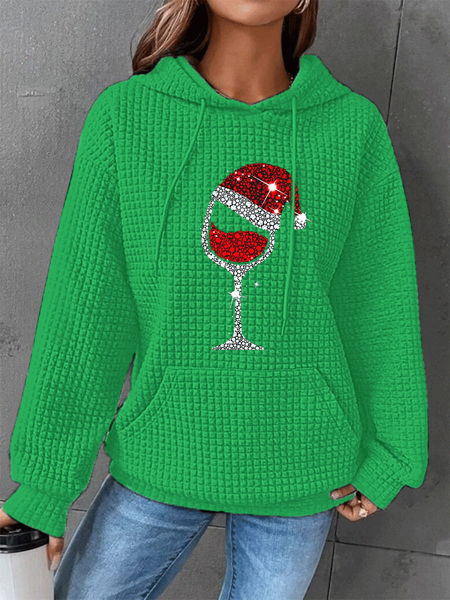 Women's Christmas Red Wine Glass Print Casual Waffle Hoodie