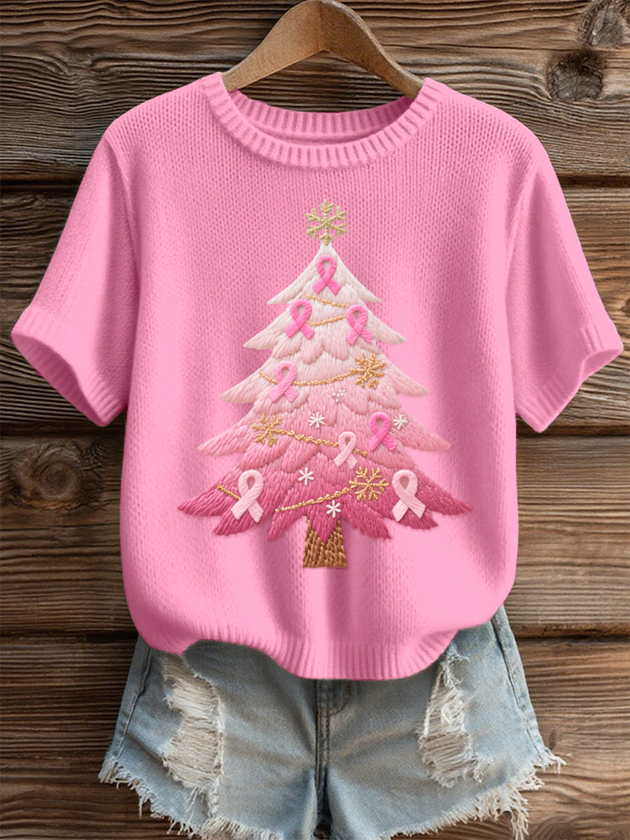 Women's Pink Christmas Tree Embroidered Cozy Knit Top
