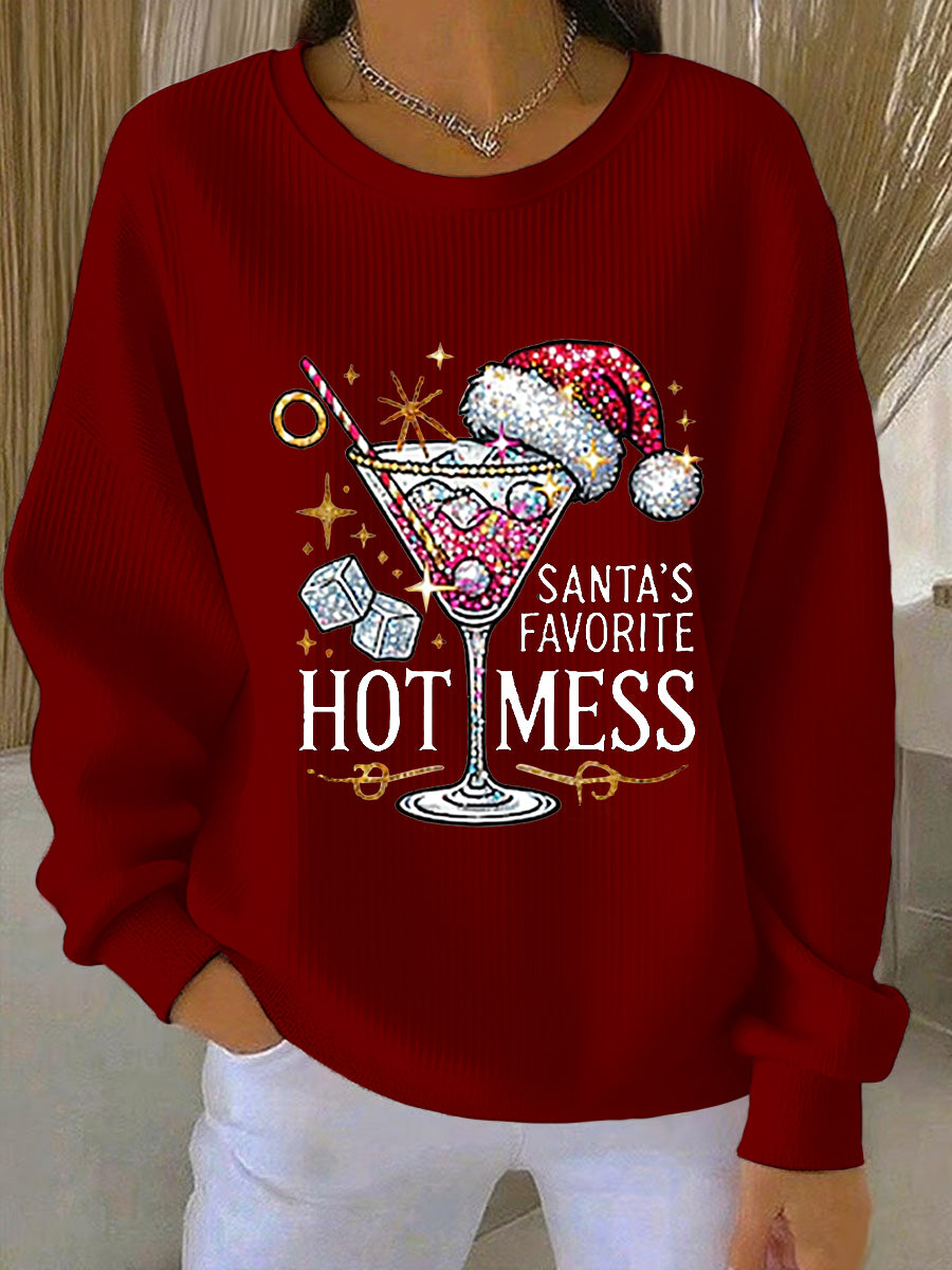 Women's Santa's Favorite Hot Mess Print Casual Ribbed Round-Neck Sweatshirt